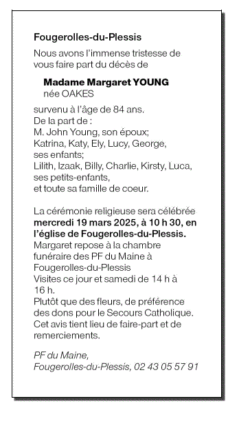 Annonce nécrologique de Margaret YOUNG née OAKES