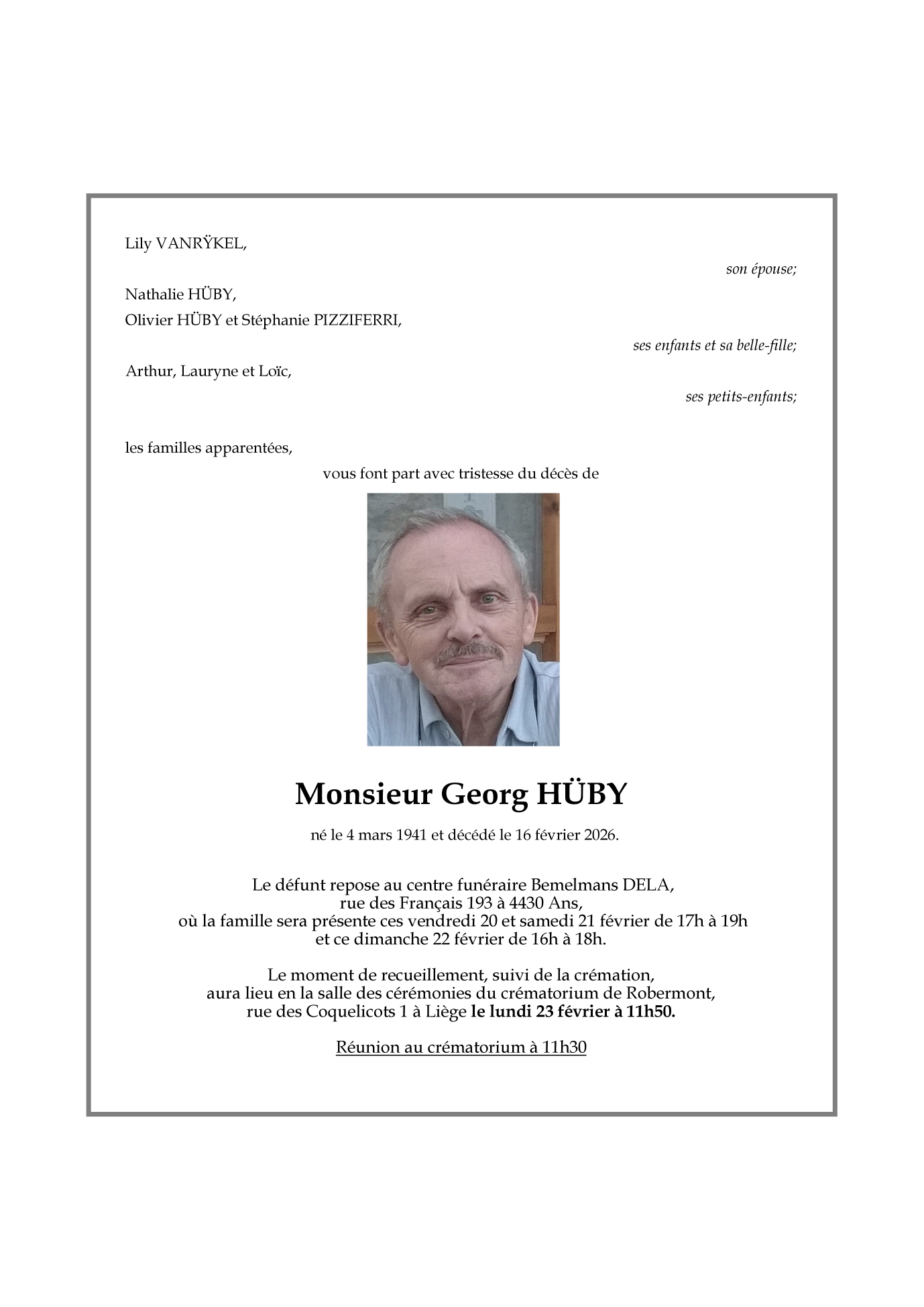 Fallecido en Ans (4430, Bélgica) el lunes, 16 de febrero de 2026 a la edad de 84 años
