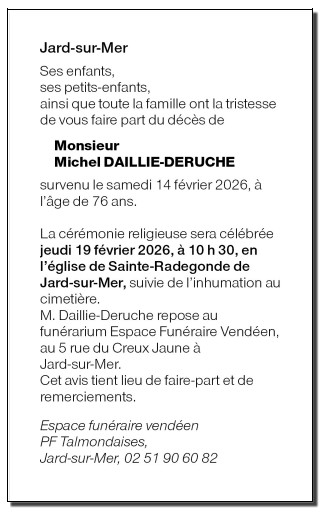 Décédé à Les Sables d'Olonne (85340) le samedi 14 février 2026 à l'âge de 76 ans