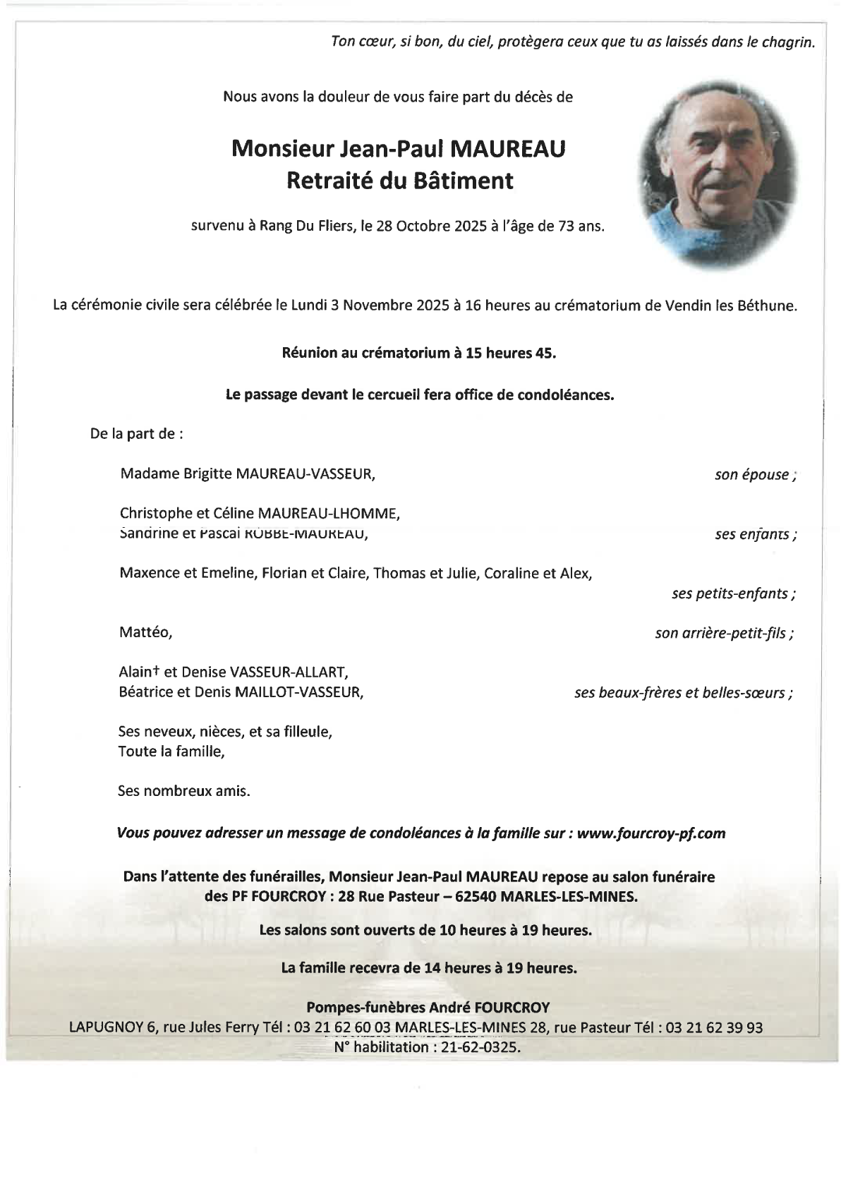 Décédé à Rang Du Fliers (62600) le mardi 28 octobre 2025 à l'âge de 73 ans