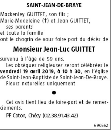 Décédé à Chécy (45430) le samedi 13 avril 2019 à l'âge de 59 ans
