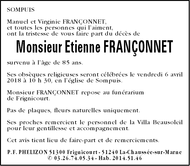 Died in Loisy-sur-Marne (51300) on 03 April 2018 at the age of 85 years