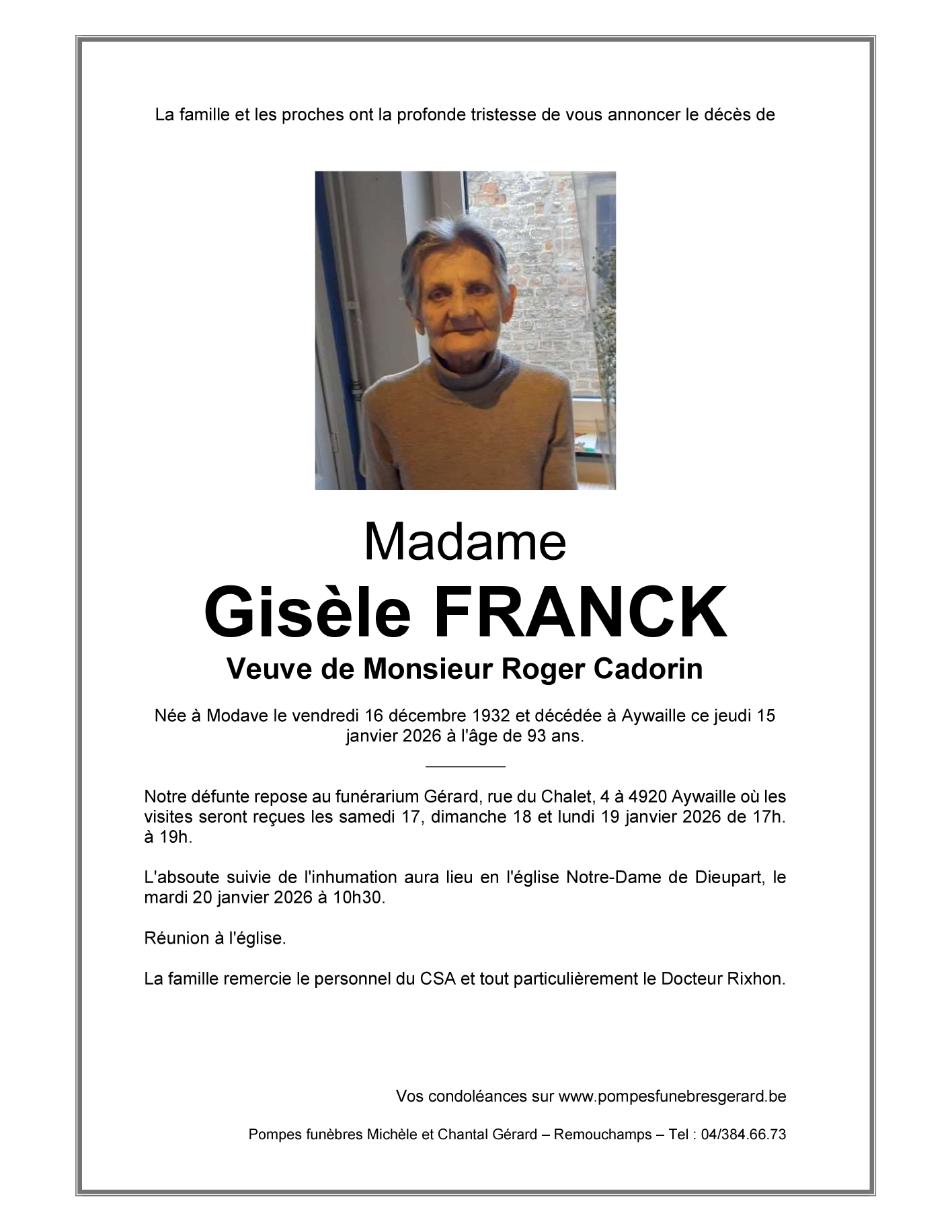 Overleden te Aywaille (4920, België) op donderdag 15 januari 2026 op 93-jarige leeftijd