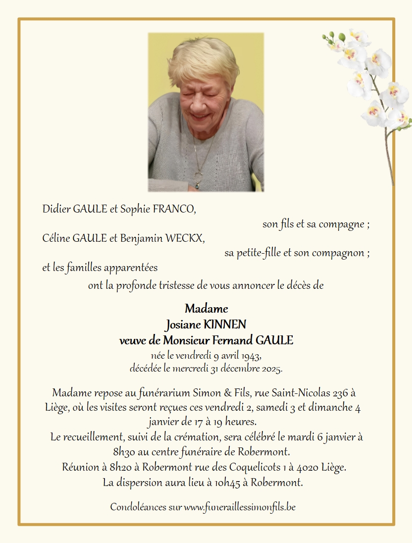 Overleden te Liège (4000, België) op woensdag 31 december 2025 op 82-jarige leeftijd