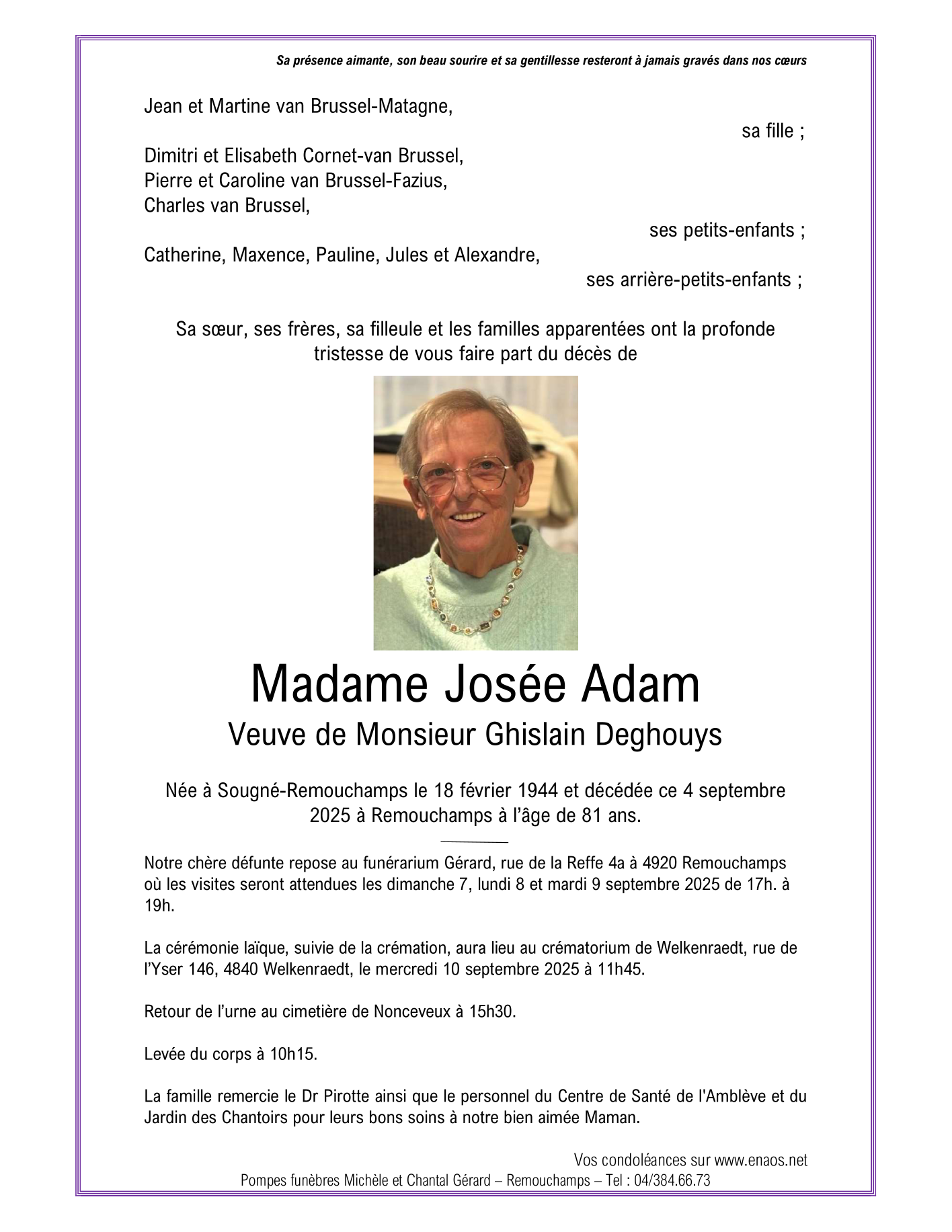 Décédée à Aywaille (4920, Belgique) le jeudi 4 septembre 2025 à l'âge de 81 ans