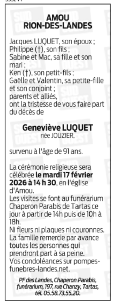 Décédée à Rion-des-Landes (40370) le vendredi 13 février 2026 à l'âge de 89 ans