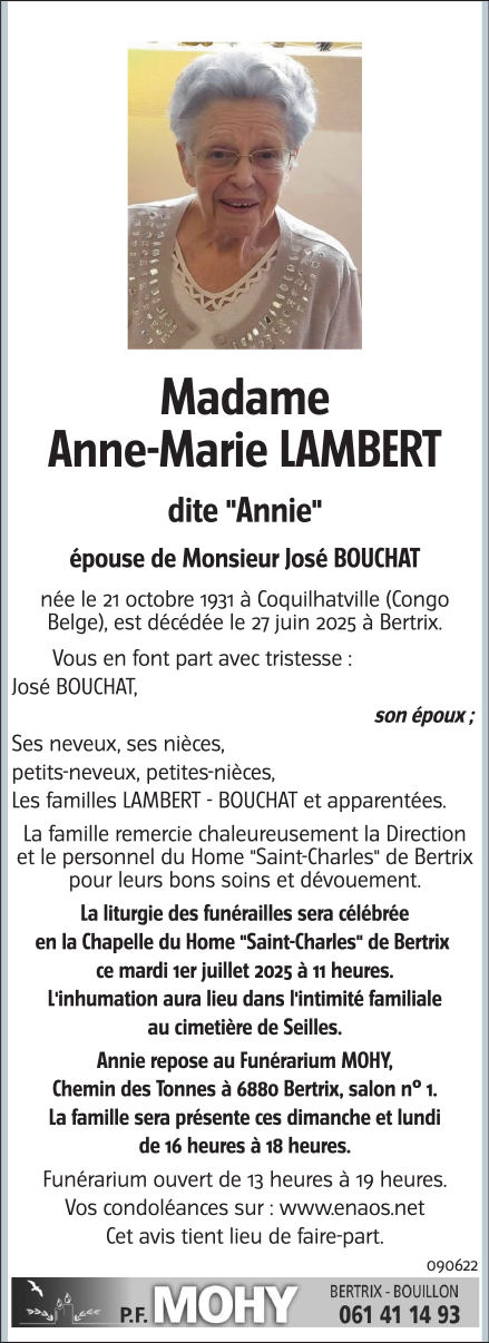 Décédée à Bertrix (6880, Belgique) le vendredi 27 juin 2025 à l'âge de 93 ans