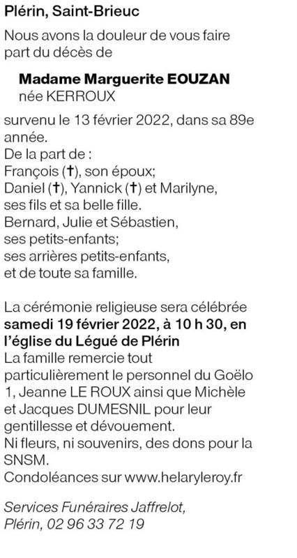 Fallecida en Saint-Brieuc (22000) el domingo, 13 de febrero de 2022 a la edad de 88 años