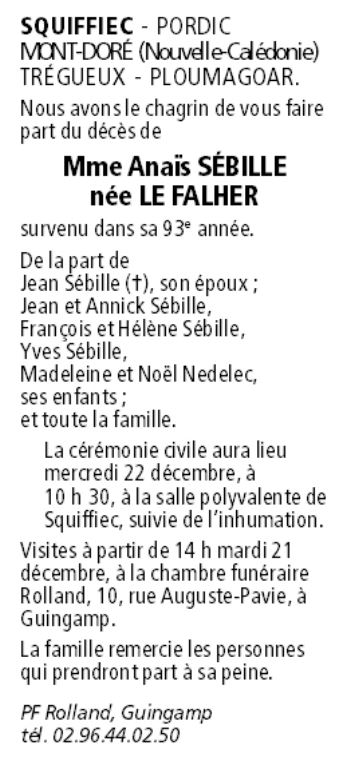 Overleden te Squiffiec (22200) op zondag 19 december 2021 op 92-jarige leeftijd