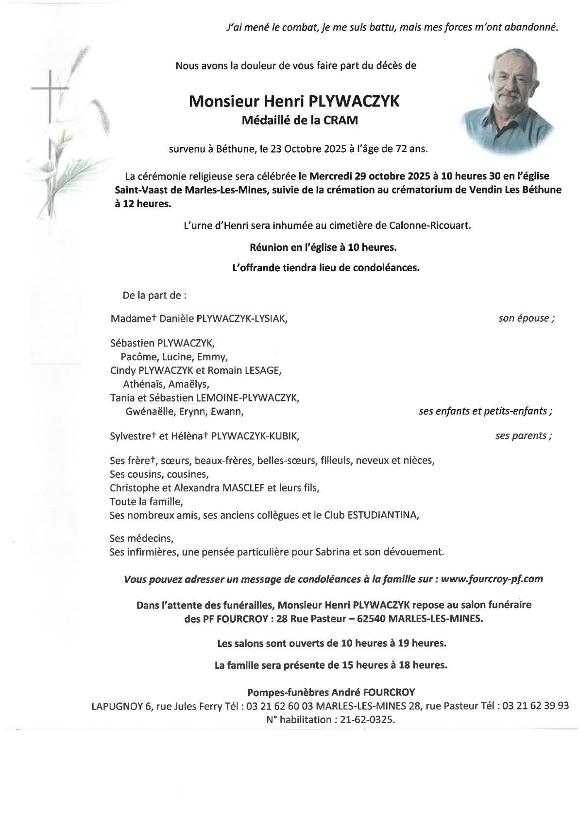 Décédé à Béthune (62400) le jeudi 23 octobre 2025 à l'âge de 72 ans