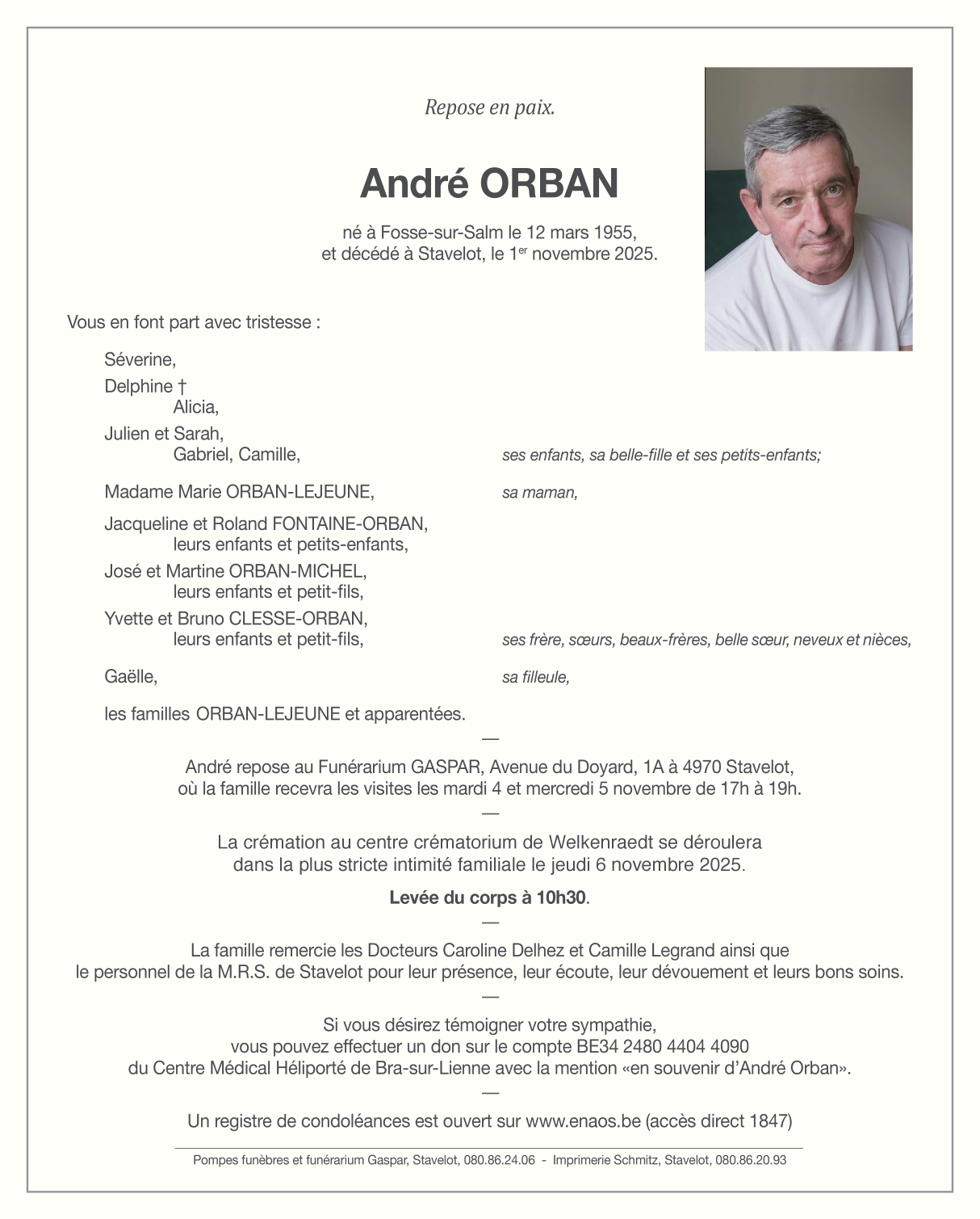 Décédé à Stavelot (4970, Belgique) le samedi 1 novembre 2025 à l'âge de 70 ans
