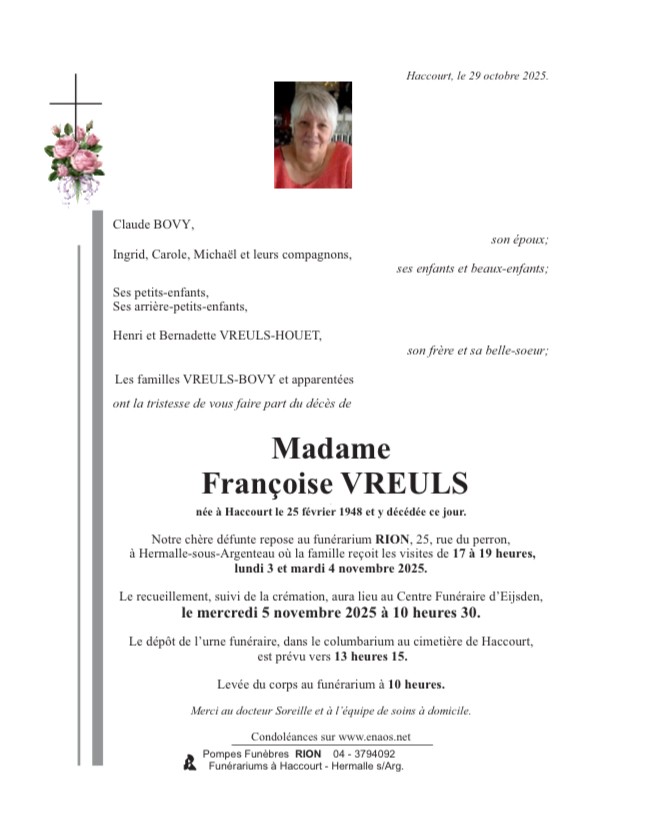 Décédée à Haccourt (4684, Belgique) le mercredi 29 octobre 2025 à l'âge de 77 ans