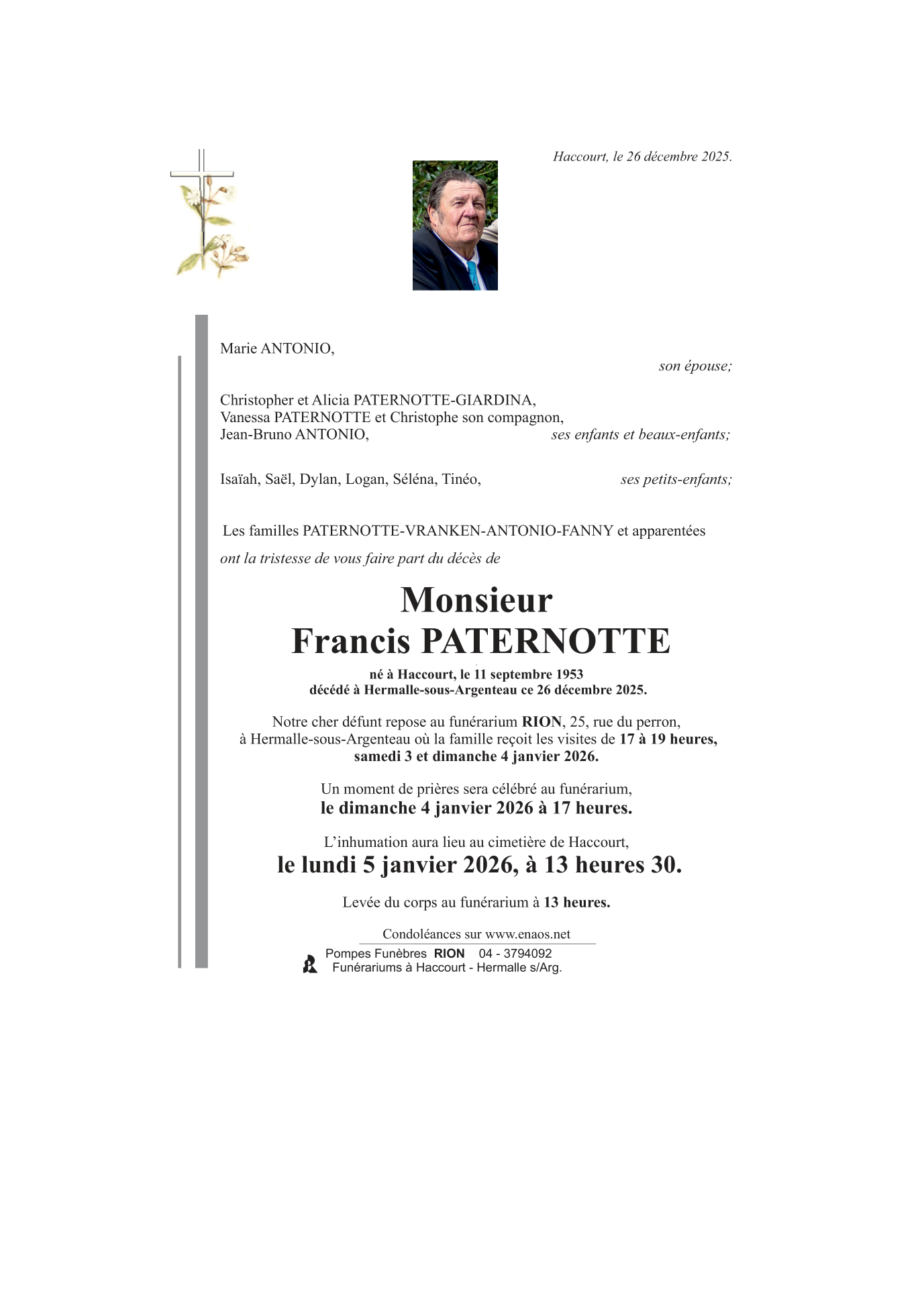 Overleden te Hermalle-sous-Argenteau (4681, België) op vrijdag 26 december 2025 op 72-jarige leeftijd