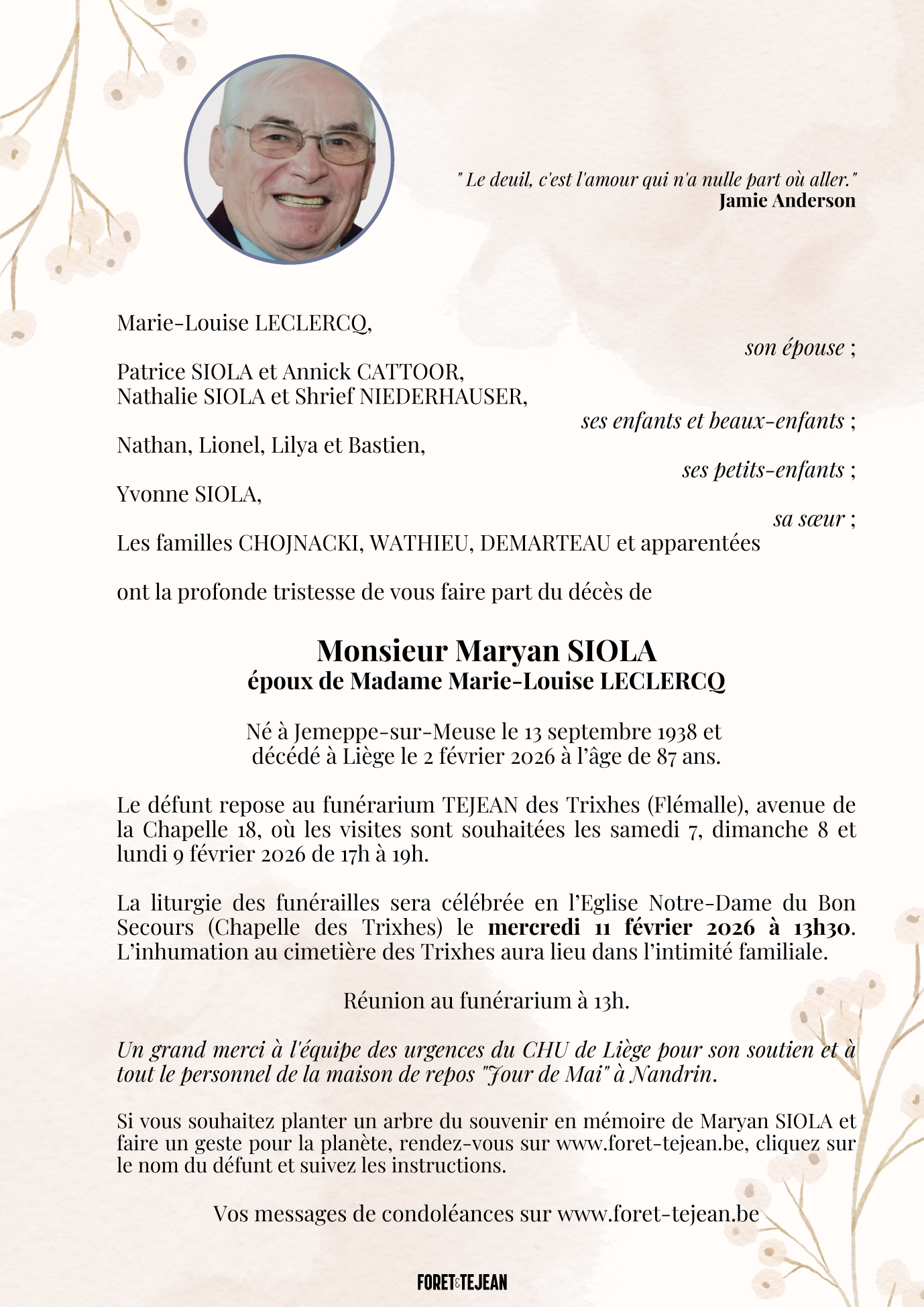 Décédé à Liège (4000, Belgique) le lundi 2 février 2026 à l'âge de 87 ans