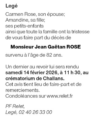 Décédé à Legé (44650) le dimanche 8 février 2026 à l'âge de 82 ans