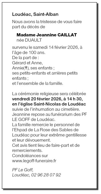 Décédée à Loudéac (22600) le samedi 14 février 2026 à l'âge de 100 ans