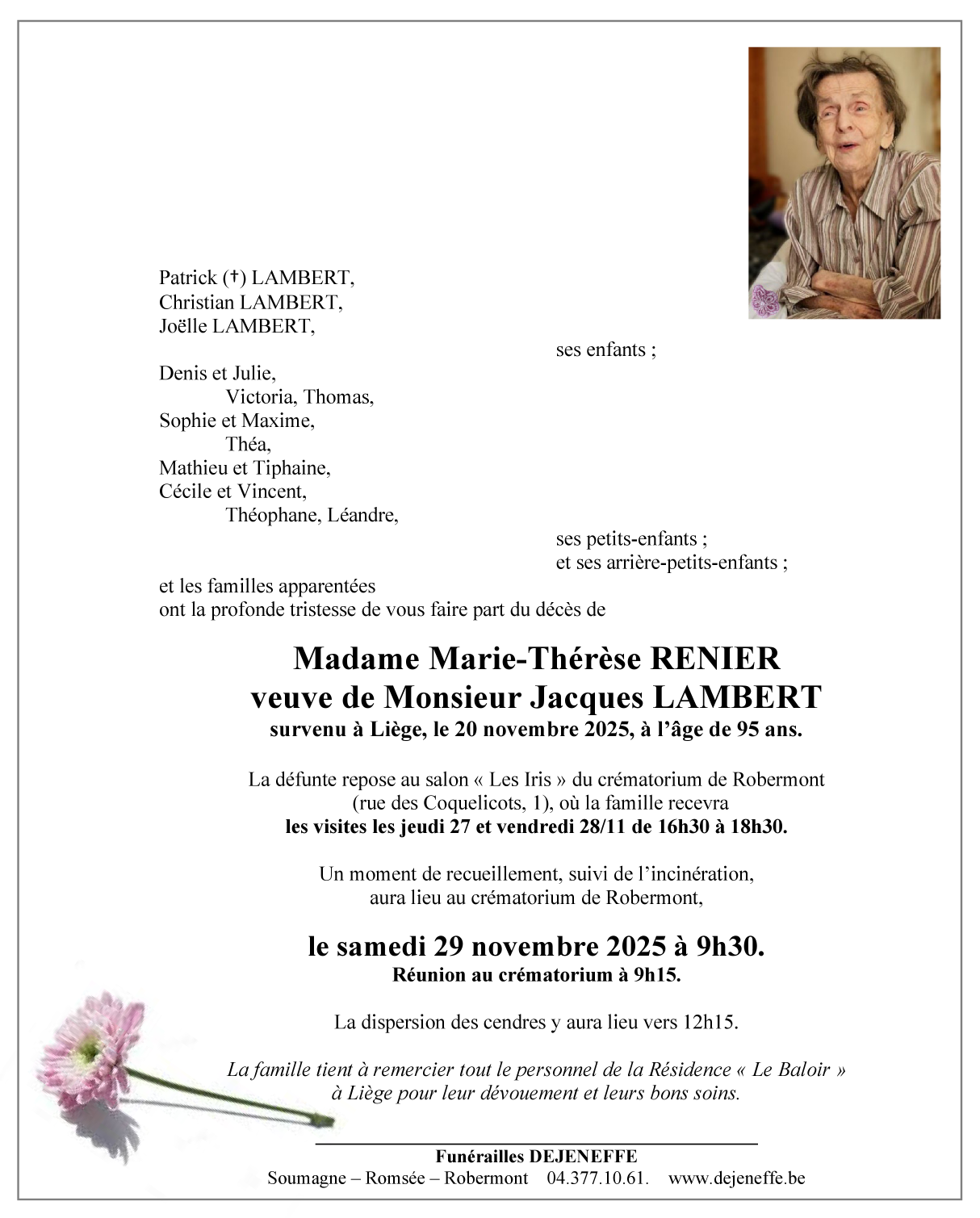 Décédée à Liège (4000, Belgique) le jeudi 20 novembre 2025 à l'âge de 95 ans