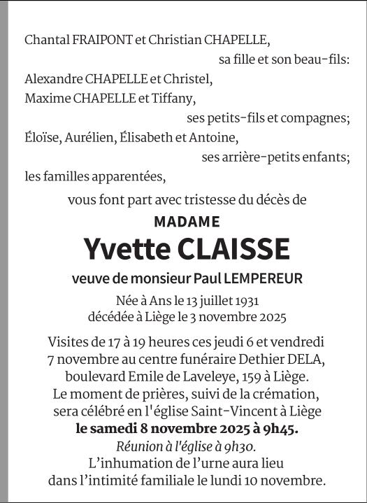 Overleden te Liège (4020, België) op maandag 3 november 2025 op 94-jarige leeftijd