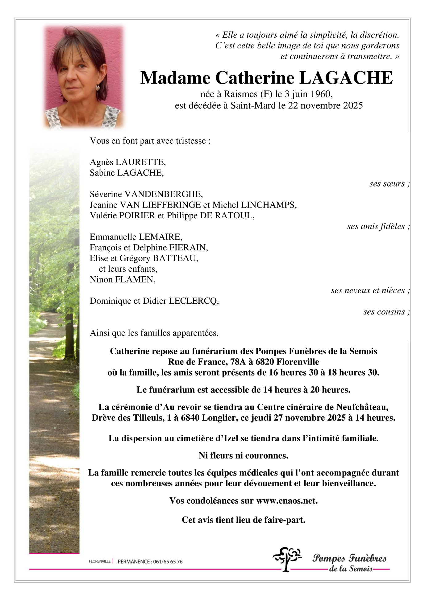 Décédée à Saint-Mard (6762, Belgique) le samedi 22 novembre 2025 à l'âge de 65 ans