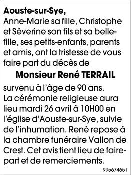 Décédé à Die (26150) le jeudi 21 avril 2022 à l'âge de 90 ans