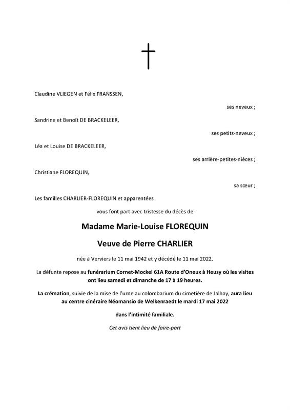 Décédée à Stembert (4801, Belgique) le mercredi 11 mai 2022 à l'âge de 80 ans