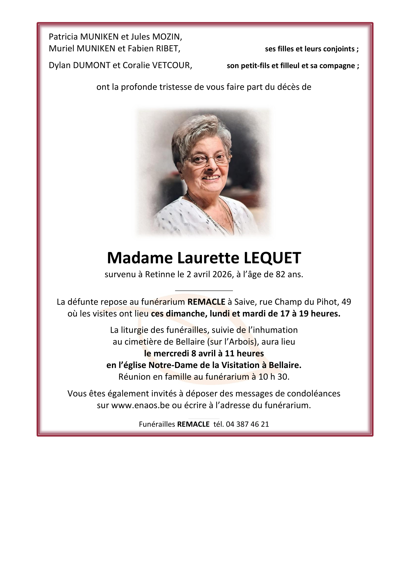 Décédée à Retinne (4621, Belgique) le jeudi 2 avril 2026 à l'âge de 82 ans