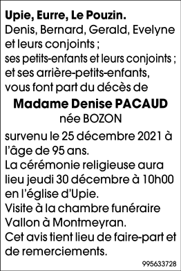 Décédée à Crest (26400) le samedi 25 décembre 2021 à l'âge de 95 ans