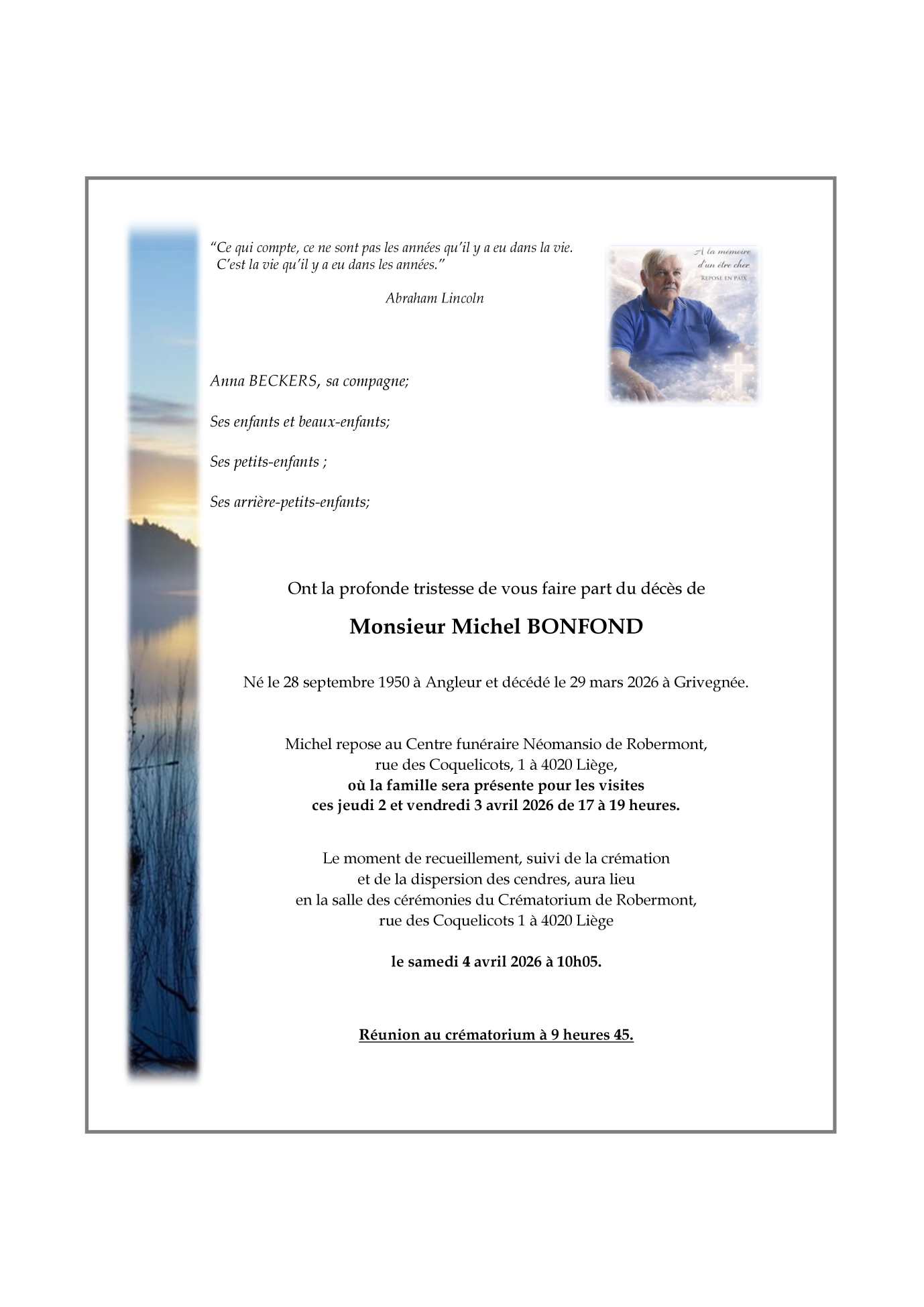 Décédé à Grivegnée (4030, Belgique) le dimanche 29 mars 2026 à l'âge de 75 ans