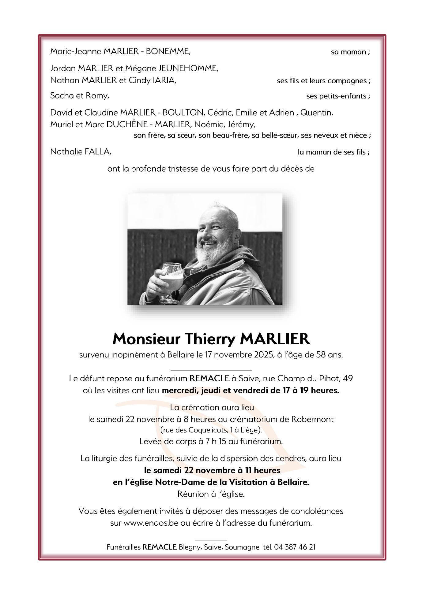 Décédé à Bellaire (4610, Belgique) le lundi 17 novembre 2025 à l'âge de 58 ans