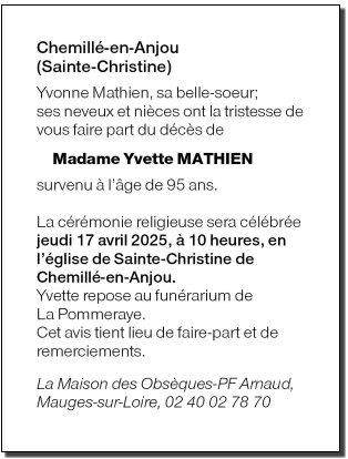 Décédée à Chalonnes-sur-Loire (49290) le dimanche 13 avril 2025 à l'âge de 95 ans