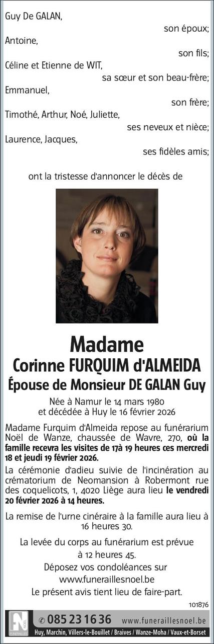 Décédée à Huy (4500, Belgique) le lundi 16 février 2026 à l'âge de 45 ans