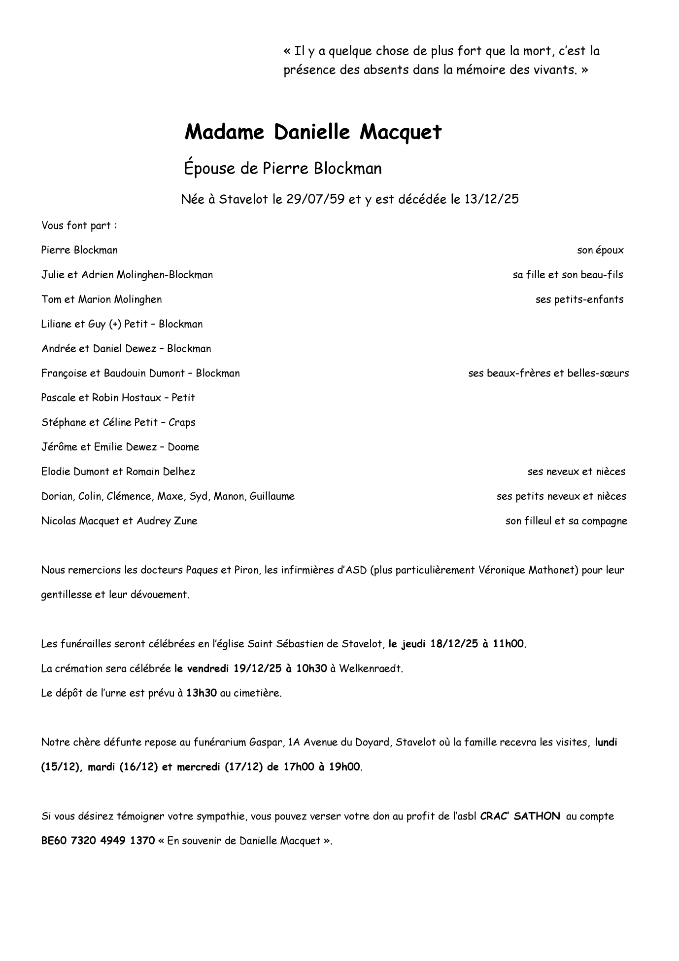 Overleden te Stavelot (4970, België) op zaterdag 13 december 2025 op 66-jarige leeftijd