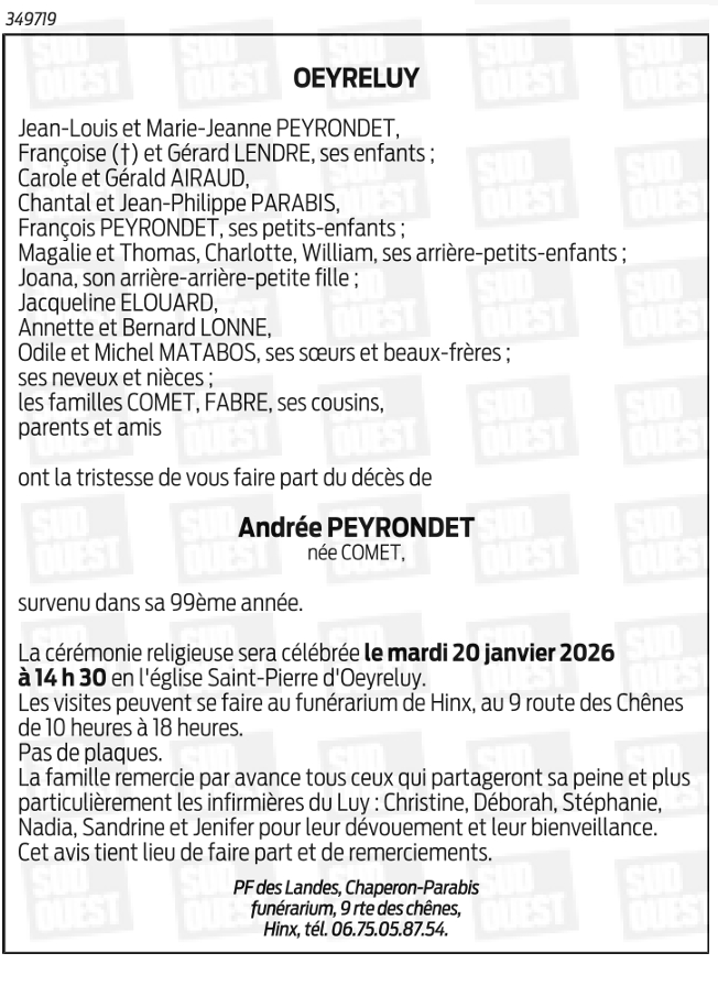Décédée à Oeyreluy (40180) le vendredi 16 janvier 2026 à l'âge de 98 ans