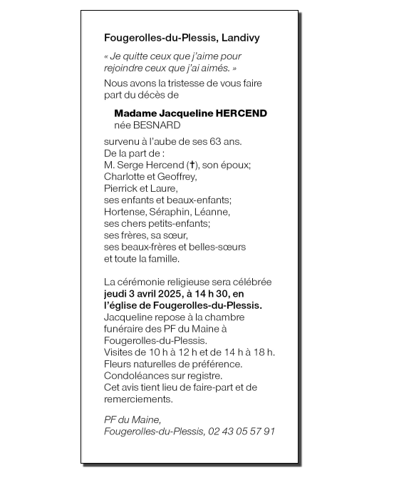 Annonce nécrologique de Mme Jacqueline HERCEND née BESNARD