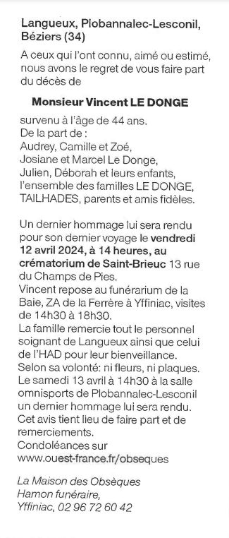Décédé à Guingamp (22200) le vendredi 5 avril 2024 à l'âge de 44 ans