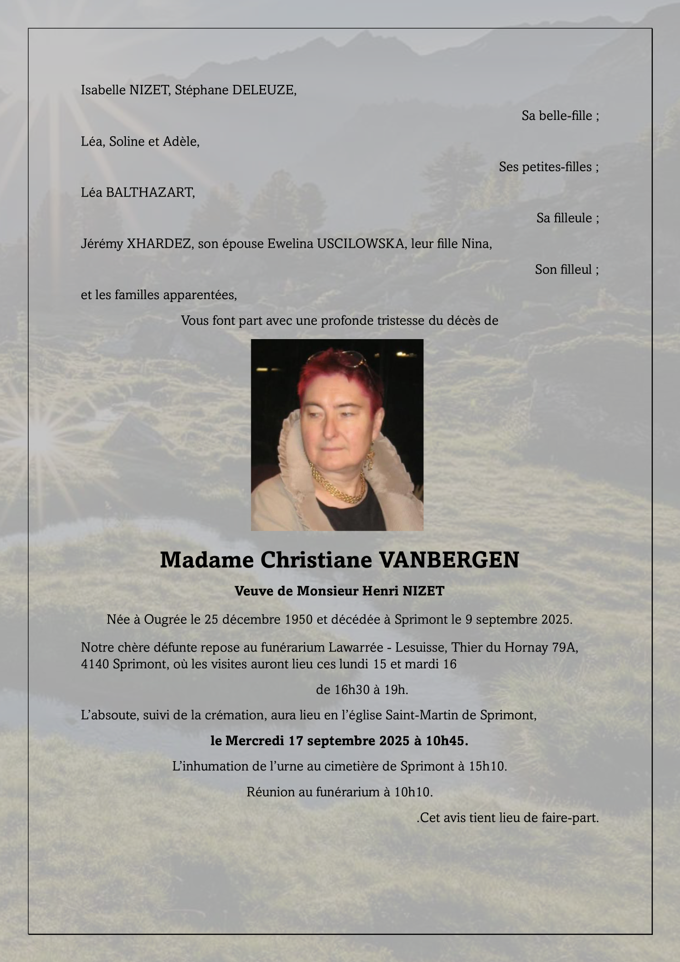 Died in Sprimont (4140, Belgium) on 09 September 2025 at the age of 74 years
