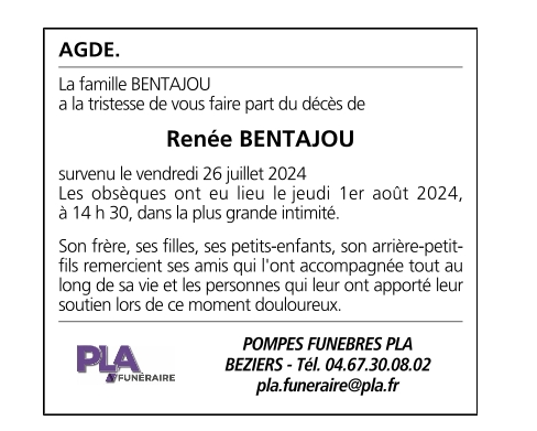 Décédée à Sète (34200) le vendredi 26 juillet 2024 à l'âge de 91 ans