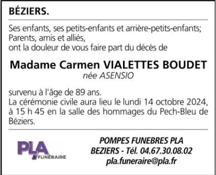 Décédée à Béziers (34500) le mercredi 9 octobre 2024 à l'âge de 89 ans