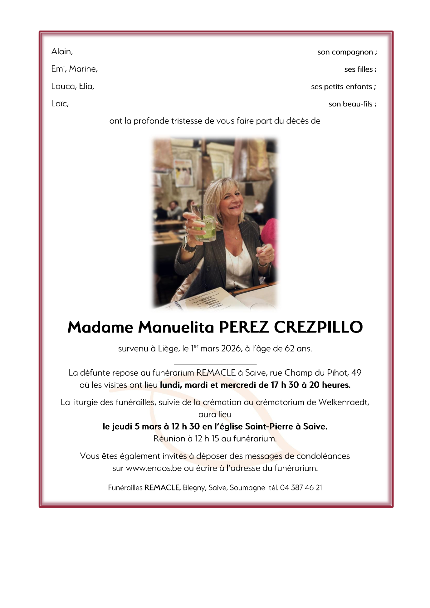 Décédée à Liège (Belgique) le dimanche 1 mars 2026 à l'âge de 62 ans