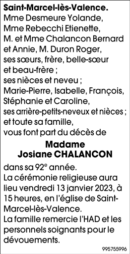 Décédée à Saint-Marcel-lès-Valence (26320) le lundi 9 janvier 2023 à l'âge de 91 ans