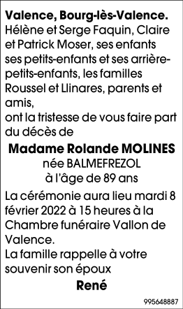 Décédée à Valence (26000) le vendredi 4 février 2022 à l'âge de 89 ans