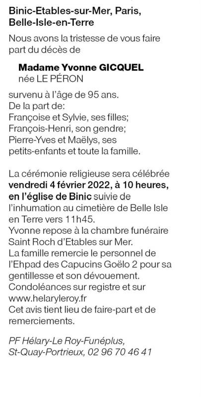 Décédée à Saint-Brieuc (22000) le dimanche 30 janvier 2022 à l'âge de 95 ans
