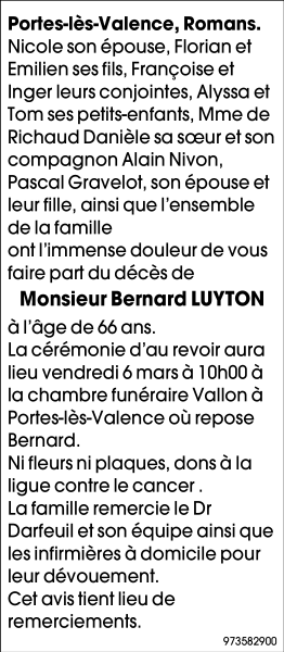 Décédé à Valence (26000) le mardi 3 mars 2020 à l'âge de 66 ans