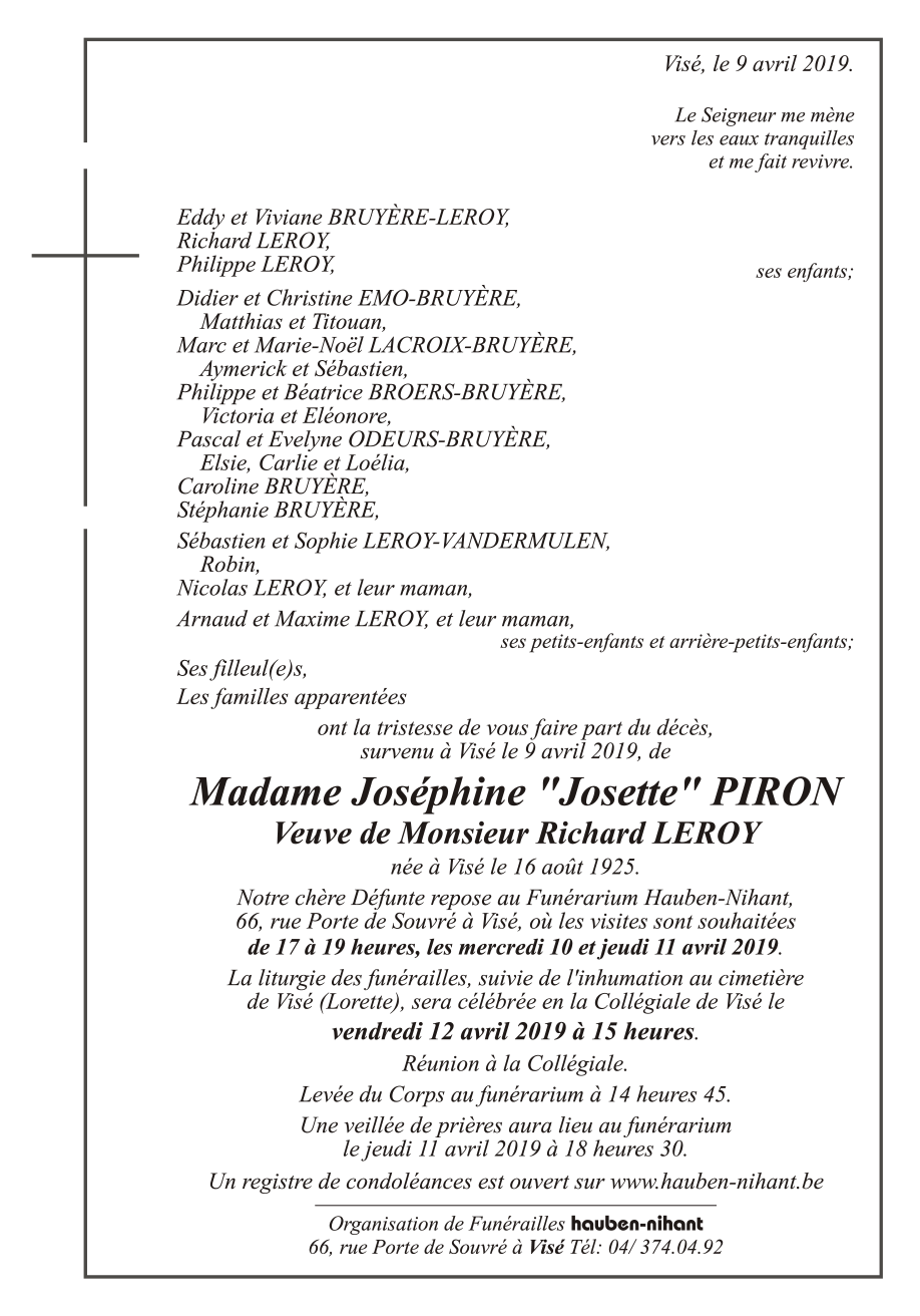 Fallecida en Visé (4600, Bélgica) el martes, 9 de abril de 2019 a la edad de 93 años