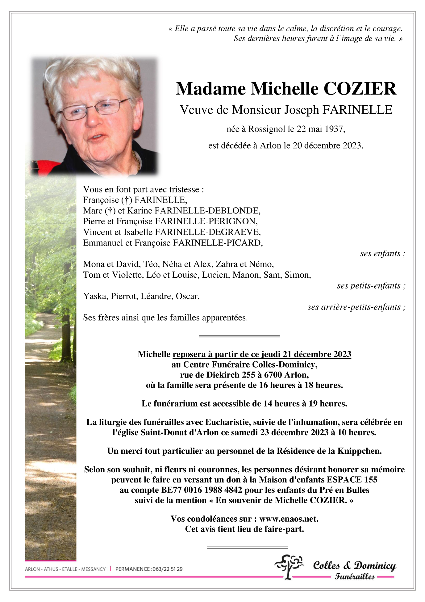 Décédée à Arlon (6700, Belgique) le mercredi 20 décembre 2023 à l'âge de 86 ans