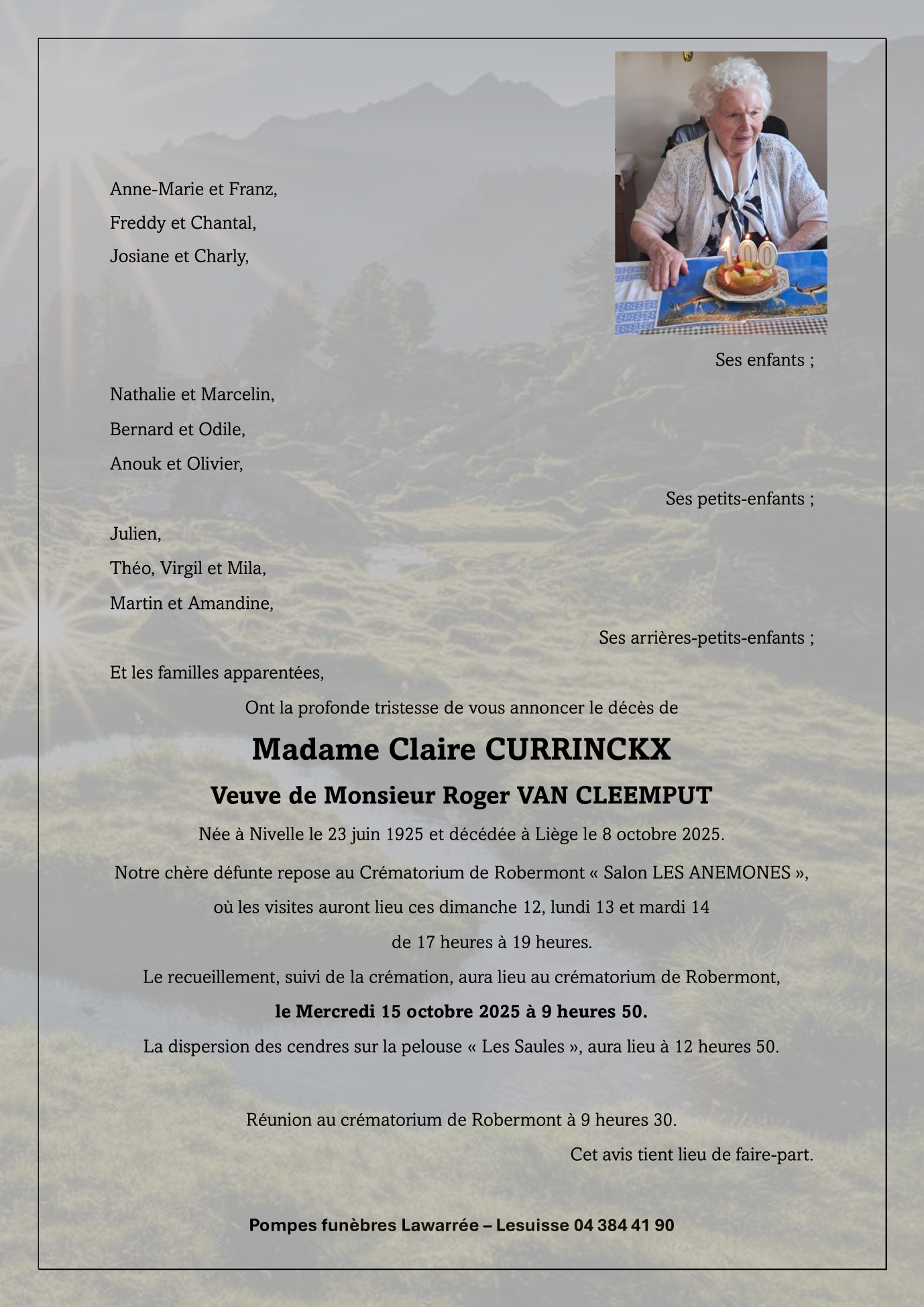 Died in Liège (4000, Belgium) on 08 October 2025 at the age of 100 years