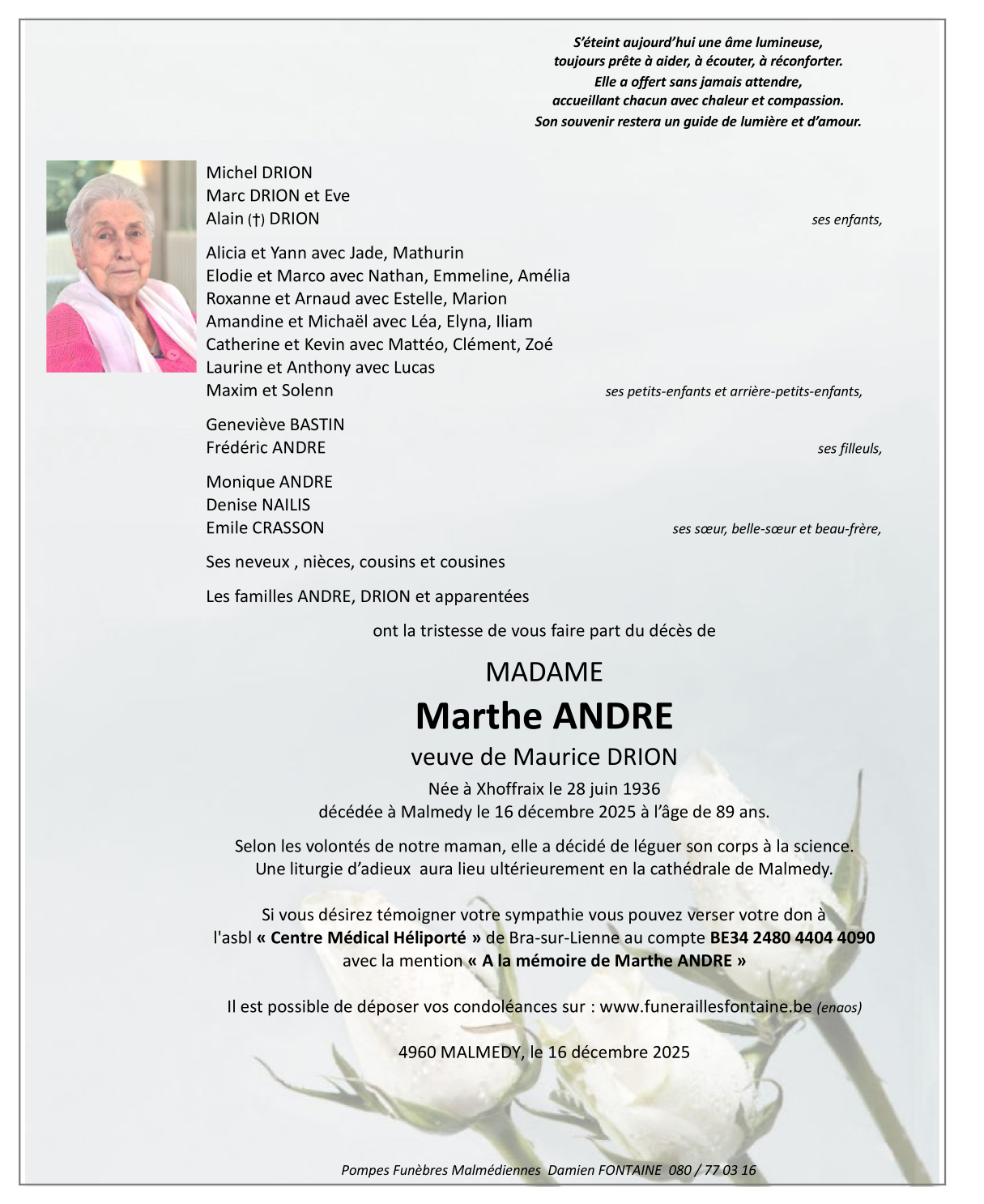 Décédée à Malmedy (4960, Belgique) le mardi 16 décembre 2025 à l'âge de 89 ans