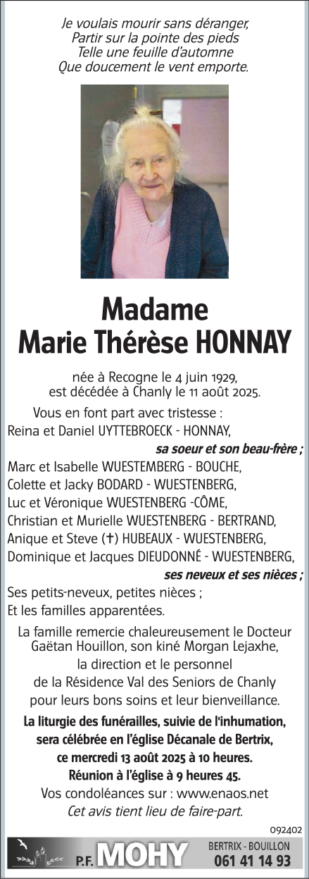 Overleden te Chanly (6921, België) op maandag 11 augustus 2025 op 96-jarige leeftijd