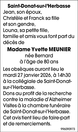 Décédée à Saint-Vallier (26240) le jeudi 22 janvier 2026 à l'âge de 80 ans