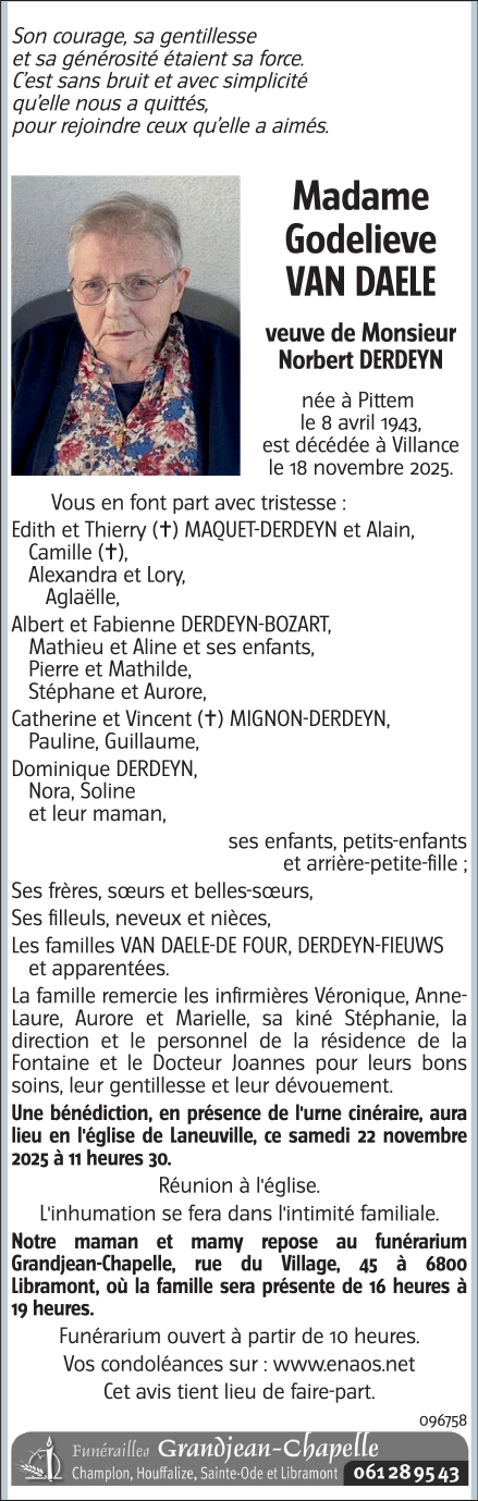 Décédée à Villance (6890, Belgique) le mardi 18 novembre 2025 à l'âge de 82 ans